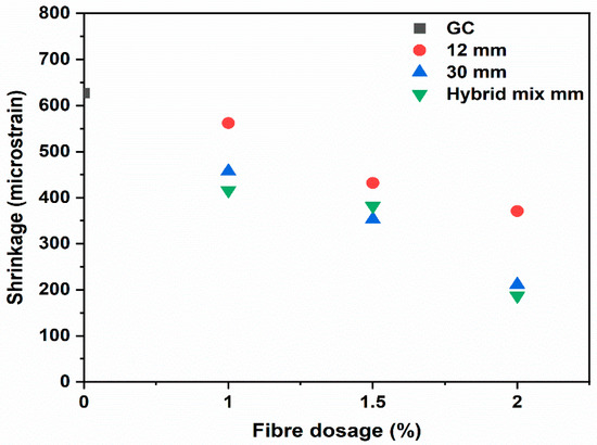 For decades, the concrete industry has strived to adopt sustainable construction techniques to enhance concrete properties and durability by employing natural and innovative constituents. Incorporating short fibres into geopolymer concrete has shown to be an efficient technique for reducing drying shrinkage and plastic shrinkage cracking [23,24,25,26,27,28,29,30]. The influence of micro steel fibres and polypropylene fibres with volume contents of (0.5, 1, 2, 3, 4)% on fly ash-based geopolymer concrete’s mechanical properties and drying shrinkage was investigated [24]. Using both fibre types in geopolymer concrete effectively reduced drying shrinkage rates. Gao et al. (2017) [26] studied the effect of 6 mm and 13 mm steel fibres, up to 1% of total volume, on the workability, mechanical properties, porosity and drying shrinkage of geopolymer concrete. It was observed that 1% of short steel fibres performed slightly better than long steel fibres, as the drying shrinkage of geopolymer concrete decreased by 32% with short fibres and 27.6% with long fibres [26]. Abdollahnejad et al. (2017) [25] investigated the effect of different glass fibre lengths—10 mm, 20 mm and 30 mm—with varying percentages of volume (0.5, 1, 1.5, 2)% on the mechanical properties and drying shrinkage of self-compacting fly ash/slag geopolymer mortar and cementitious mortar. The study results indicate that adding glass fibres to fly ash/slag geopolymer mortar significantly reduces the drying shrinkage and improves the mechanical properties. The study reported that 1.5% glass fibres are the optimum dosage, as beyond this dosage, the drying shrinkage of geopolymer concrete is not affected or may decrease [25]. Abdollahnejad et al. (2018) [30] reported that adding steel fibres, PVA fibres and polypropylene fibres independently to slag-based geopolymer concrete considerably reduces shrinkage and prevents cracks formation. Including polypropylene fibres (PP) with a volume content of 0.75% in calcined kaolin–fly-ash-based geopolymer reduces the drying shrinkage by approximately 30% compared to plain mix [27]. Using fibres to strengthen the mix compositions is an efficient and relatively simple technique to decrease shrinkage and crack propagation compared to other methods.