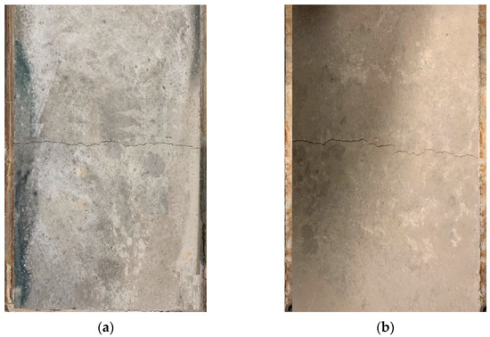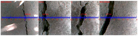 The plastic shrinkage cracking test was commenced directly 20 min after casting, and the final setting time occurred approximately 6 h after casting for all panels. The evaporation rate from the pan of water was measured every 30 min until the mix’s last setting time, and the evaporation rate was above 1 kg/m2, which complies with test requirements set by ASTM C1579-06 [54]. Plastic shrinkage cracking widths were manually measured using a crack width gauge and image analysis by ImageJ 1.51 software. Furthermore, 24 h after the casting time, images were taken, as shown in Figure 13, to analyse the cracks’ widths and areas. Figure 13a,b present the panel surface cracks of SCGC and SCGC reinforced with 1% of 12 mm BFs, respectively. The crack widths were measured at 50 mm intervals along the path, and the average value was reported. Figure 14 presents additional images of measured crack widths using a crack width gauge. In plain SCGC panels, the early-age cracks began to appear 3.5 h from the start time of the test and developed into macro-cracks in 30 min. The average crack width for SCGC panels 6 h and 24 h after casting is 0.5 mm and 0.87 mm, respectively. SCGC incorporated with a 1% dosage of 12 mm BFs showed a longer required 4 h for the first crack appearance. The average crack width for SCGC panels reinforced with 1% of 12 mm BFs 6 h and 24 h after casting is 0.22 mm and 0.32 mm, respectively.