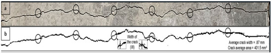 The image analysis technique was used to measure the average crack width and area of SCGC. (a) original greyscale image, (b) binary image.
