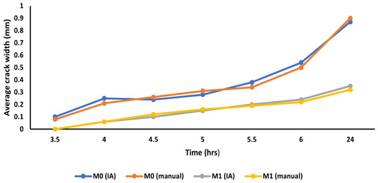 In addition to the manual measurement of cracks, image analysis was used to validate the accuracy of the obtained manual crack width measurements. The width of the crack was measured at multiple locations (usually at six locations, as shown in Figure 15) throughout the whole crack length. Figure 16 presents the crack width propagation measured using a crack width gauge (manual) and image analysis for SCGC and SCGC reinforced with a 1% dosage of 12 mm BFs. The results show that both image analysis and manual measurement results are in good agreement, as variations in crack width between the two methods are less than 5%. Based on the image analysis results, using a 1% dosage of 12 mm BFs in SCGC reduces crack area by approximately 60% compared to plain SCGC.