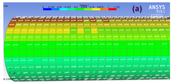 The CFRP bonded pipe (pressure armour) was modelled considering 40 layers of CFRP layers and 1 thick layer of the PA12 polymer layer [4,37]. The thin wear protecting layers (polymer sheaths) were not included in the model (Figure 2b). The model was prepared in the Ansys 2018, ACP pre-processor. The orthotropic material properties were for the CFRP layer, whereas the thickest polymer layer (0.0984 in) was for the PA-12 properties.