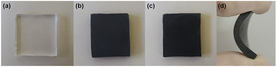 PDMS-based nanocomposite samples (30 mm × 30 mm) after curing: (a) neat PDMS, (b) 15% GNP/PDMS, (c) 30% GNP-DNA/PDMS. (d) Lateral view of a flexed GNP/PDMS sample.