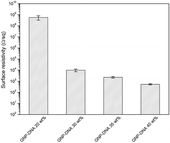 Surface electrical resistivity of GNP-DNA/PDMS nanocomposites as a function of the filler concentration showing a threshold for the GNP-DNA content of between 20 and 30 wt%.