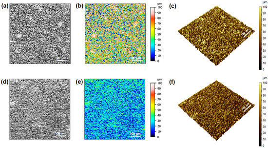 Before exposure, the GNP-DNA/PDMS sample (Figure 4a–c) showed more agglomerates and irregular features at its surface than the GNP/PDMS type (Figure 5a–c). After testing in a simulated space environment, the nanocomposite with the GNP-DNA filler (Figure 4d–f) was clearly affected by the exposure to solar radiation with its surface structure appearing much smoother than that of the nonirradiated samples (Figure 4a–c). This effect was quantified using the average surface roughness (Ra) values calculated from the 3D reconstructions of the surface topography (Table 1). The GNP/PDMS nanocomposite shows a negligible variation (−8.0%) of its surface roughness after exposure to solar radiation (Figure 5d–f), whereas a marked decrease (−59.0%) was observed for the GNP-DNA/PDMS samples (Figure 4d–f). This effect can be linked to the presence of the biological element that is highly susceptible to solar radiation damage, particularly to the ultraviolet component of the spectrum [40].