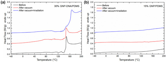 DSC thermograms (heating rate 10 °C/min) for (a) 30% GNP-DNA/PDMS and (b) 15% GNP/PDMS nanocomposites before and after 24 h testing in a thermal vacuum chamber under high vacuum (~10−6 mbar) and combined high vacuum/solar irradiation (solar exposure time 4 h). Thermograms are vertically offset by 0.4 W/g for clarity.