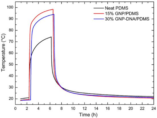 This result can be linked to the dehydration process promoted by high vacuum [53,54], which causes water release from the sample. Indeed, the biological DNA element is highly hydrophilic and might retain water vapour during nanocomposite assembly in Earth environments. In addition, over the course of the test under simulated space conditions, in particular under solar irradiation, the GNP-DNA/PDMS and GNP/PDMS nanocomposites reached temperature values of 94 °C and 98 °C, respectively (Figure 7).