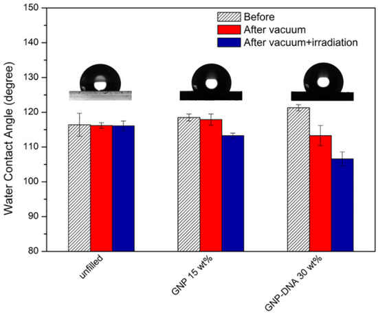 Water contact angles of PDMS-based nanocomposites with 15 wt% of unmodified GNP and 30 wt% of GNP-DNA filler and comparison with neat PDMS before and after testing in a simulated space environment under high vacuum (~10−6 mbar, 24 h) with or without solar irradiation.