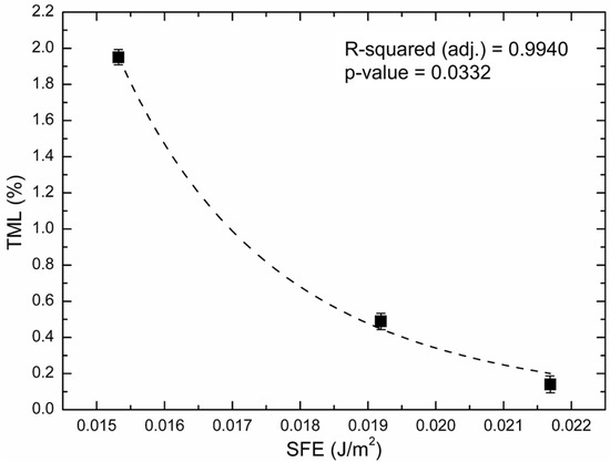 The values of A and B were found to be 2.64 × 10−12 and −6.54, respectively, with an adjusted R-squared value of 0.9940. In addition, an analysis of variance (ANOVA) was performed, and a p-value of 0.0332 was found, confirming the statistical significance of the results (p < 0.05). We suggest that this type of correlation could be used to predict the outgassing properties of PDMS-based materials with different filler loadings from knowledge of their initial SFE values. This approach would be quite useful to compensate for the limited availability of TML data due to the expensive tests and equipment.