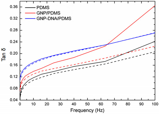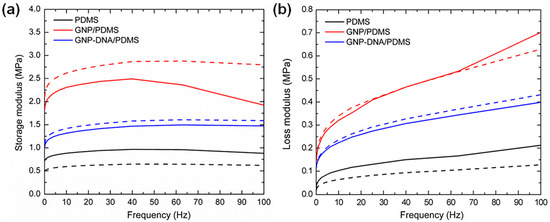 The mechanical properties of the elastomeric graphene/polysiloxane nanocomposites were determined with a dynamic mechanical analysis (DMA). The results in terms of storage and loss moduli are reported in Figure 10. The storage modulus represents the stiffness of viscoelastic materials and, at room temperature, is related to the flexural modulus [58]. Figure 10a highlights larger values of the storage modulus for the GNP/PDMS sample. This can be ascribed to the mechanical interlocking caused by the presence of GNP, which restricts the polymer chain mobility [59]. A decrease in the storage modulus was observed starting from frequencies of greater than 50 Hz.