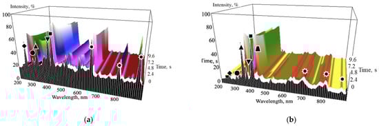 On the plasma spectra (Figure 1) recorded during the deposition of coatings, the main peaks observed were those of the ions of the target components: Mon+, Sin+, B+, Hfn+, and Yn+ at positions 390.1, 288.2, 249.1, 286.6, and 377.5 nm, respectively.