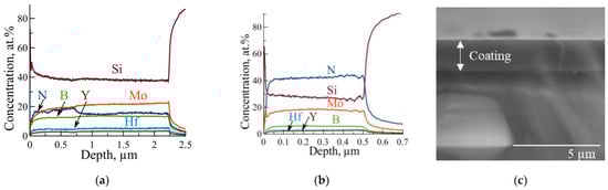The non-reactive Mo-Hf-Y-Si-B coating was characterized by maximal thickness of 2.7 µm and growth rate of 270 nm/min. Increasing the nitrogen flow rate to 12.5, 25.0, and 37.5 sccm led to a decrease in thickness and growth rate by 1.1, 1.4, and 5.4 times, respectively. A decrease in the growth rate can be associated with the poisoning of the target by the reaction gas and the formation of a nitrogen-containing layer on its surface [], as well as with a lower nitrogen ionization coefficient compared with Ar and the scattering of sputtered atoms by heavier molecules of nitrogen [].