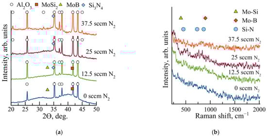 Raman spectra made it possible to refine the phase composition of the X-ray amorphous Mo-Hf-Y-Si-B-N coatings (Figure 3b). For the non-reactive coating, peaks were detected at positions 400 and 970 cm−1, corresponding to Mo-Si [] and Mo-B [] bonds. An increase in nitrogen consumption led to the formation of the Si-N bond in the Mo-Hf-Y-Si-B-N coatings, the peaks of which were observed at positions 450, 730, and 860 cm−1 [].