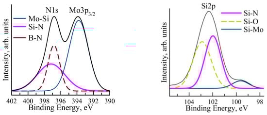 For a better understanding of the chemical arrangement, the XPS method was used. Figure 4 shows the high-resolution N1s, Si2p, Mo3d, and B1s spectra taken from Mo-Y-Si-B-N coatings obtained at 37.5 sccm N2. The spectrum of N1s showed an intense peak at 397.3 eV corresponding to B-N (396.7 eV) [] and Si-N (397.5 eV) []. The Mo3d spectrum contained two main doublets described by the 3d5/2 and 3d3/2 states. Peaks corresponding to binding energies of 227.6 and 230.8 eV indicate that molybdenum is chemically bonded to silicon [,]. Low-intensity peaks at positions 228.8 and 232.3 eV correspond to Mo-O bonds []. According to the B1s spectra, B-N bonds were also present in the coatings []. The Si2p spectrum with maxima at positions 101.8 eV and 102.9 confirmed the presence of Si-N and Si-O bonds [,]. A peak at the binding energy of 99.6 eV corresponds to molybdenum silicide []. Thus, Mo-Si and Mo-B bonds were present in the coatings, and yttrium atoms were predominantly bonded to silicon and oxygen atoms.