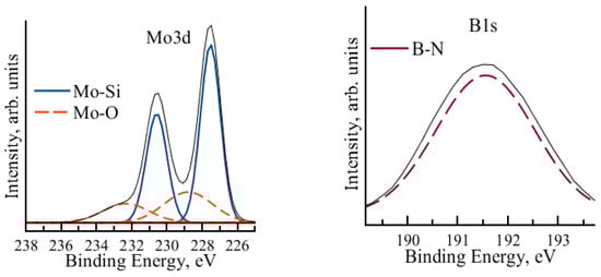 In our laboratory, using the direct current magnetron sputtering method and multiphase cathodes, the following coatings were obtained: ZrSiB with oxidation resistance up to 1500 °C []; MoSiB, up to 1700 °C []; and MoHfZrSiB, up to 1500 °C []. In addition, a hybrid technology that combines the electrospark alloying of a heat-resistant nickel alloy with the subsequent deposition of a MoSiB layer using magnetron sputtering has been successfully applied [].