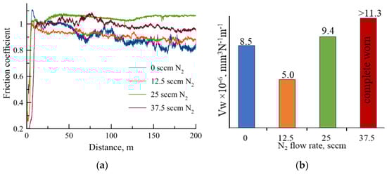 Increasing the nitrogen flow rate from 0 to 12.5 sccm led to a decrease in the wear rate from 8.5 to 5.0 × 10−6 mm3N−1m−1 under sliding friction conditions.
