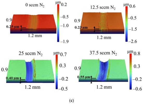 Tribological tests in sliding friction mode showed that the coatings obtained on Al2O3 substrates at nitrogen flow rates of 0 and 12.5 sccm showed close values of friction coefficient f = 0.90 ± 0.03 (Figure 6). Increases in nitrogen flow rate to 25 and 37.5 sccm led to increases in the friction coefficient to 0.98 ± 0.02 and 1.02 ± 0.03, respectively. A study of the wear tracks using optical profilometry showed that the wear rate (Vw) of the non-reactive coating was 8.5 × 10−6 mm3N−1m−1. The minimum Vw = 5.0 × 10−6 mm3N−1m−1 was characteristic of the coating obtained at a 12.5 sccm N2 flow rate. Increasing the nitrogen flow rate to 25 and 37.5 sccm led to increases in Vw by 1.9 and 2.3 times, respectively. It should be noted that the coating obtained at 37.5 sccm N2 was worn out to the full depth.