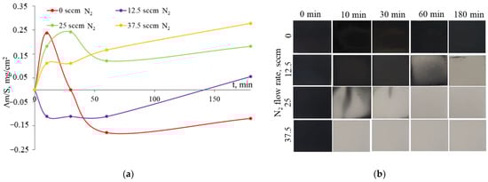 For the non-reactive coating, Δm/S = 0.24 mg/cm2 was observed in the initial time period of 0–10 min, which was associated with the formation of an oxide layer on the coating surface. A further decrease in Δm/S to −0.12 mg/cm2 after exposure times of 10–180 min can be explained by the formation of volatile oxide MoO3 [,]. The specific weight of the coating obtained at 12.5 sccm N2 was −0.11 mg/cm2 after exposure times of 10–60 min. After 180 min, Δm/S increased to 0.06 mg/cm2 due to the rapid oxidation of the coating. For coatings deposited at 25.0 and 37.5 sccm N2, an increase in Δm/S was observed at all holding times, which was associated with the formation of an oxide layer on the coating surface.