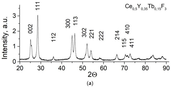 - Nizamutdinov, A.S.; Madirov, E.I.; Lukinova, E.V.; Kiyamov, A.G.; Andreeva, D.D.; Pudovkin, M.S.; Korableva, S.L.; Semashko, V.V. Spectral-Kinetic Properties and Energy Transfer in Nanoparticles of Y0.5–x Ce0.5 Tbx F3 Solid Solution. J. Appl. Spectrosc. 2020, 87, 481–487. [Google Scholar] [CrossRef]