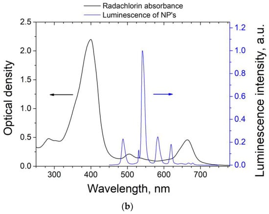 The Ce0.5Y0.35Tb0.15F3 fluoride material is well studied for different photonic applications [8,9]. In our previous work, the spectral–kinetic properties as well as morphology and chemical composition of these NPs was thoroughly investigated [8]. It was established that upon ultraviolet excitation, the NPs produce intense emissions in the visible range with lifetimes around 10 ms, which is the result of efficient nonradiative resonant energy transfer from Ce3+ ions to Tb3+ ions. It can be seen that Tb3+-doped materials can potentially sensitize the chlorine-based PDT agents due to good overlapping of the absorption spectrum of the latter and emission of Tb3+ ions. It was also discovered that the most promising composition for use with chlorine e6 is Ce0.5Y0.35Tb0.15F3. In our work, we have investigated the chlorine e6-based commercially available photosensitizer Radachlorin [10], which is extensively investigated at the moment in various biomedical applications and utilized in clinical trials [11,12,13].