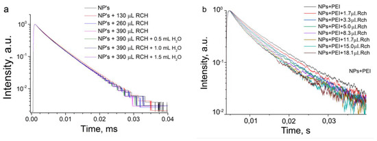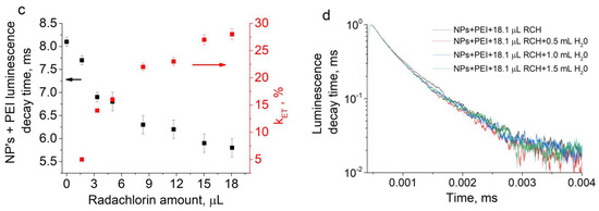 Our results show that luminescence decay of NPs in colloid solution does not change with the addition of Radachlorin (Figure 2a), whereas we see the shortening of luminescence decay for PEI-NP in the presence of Radachlorin even for smaller amounts (Figure 2b). The data explicitly shows that the addition of Radachlorin leads to a decrease in decay time of Tb3+ luminescence. This means that there is efficient energy transfer between NPs and Radachlorin. The behavior of the obtained decays appeared to be close to single-exponential for non-coated nanoparticles and significantly deviated from those coated with PEI, so the decay time was then estimated as an averaged decay time [19]: