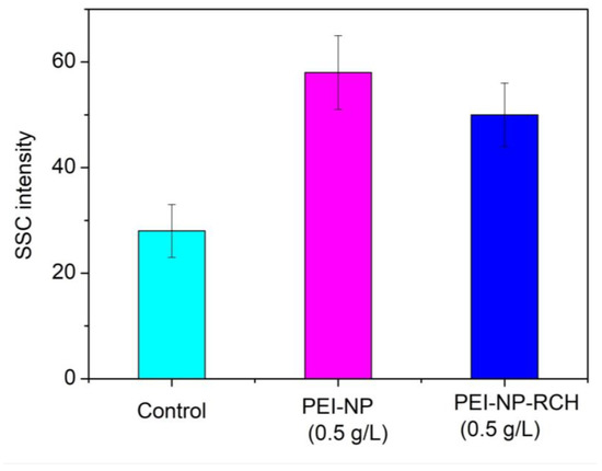It can be seen that both PEI-NP and PEI-NP-RCH double SSC intensity in comparison to control. Indeed, according to [33], the PEI coating of Er3+, Yb3+:NaYF4 fluoride nanoparticles provides 5 times higher positive zeta potential than PVP coating (51.1 and 10.2 mV, respectively). As it was mentioned above, the particles with high zeta potential effectively interact with the negatively charged cell membrane. Significant differences between the SSC intensity of cells treated with PEI-NP and PEI-NP-RCH were not found. We also estimated cytotoxicity of bare NPs, which was low. The results are represented in Table 2. The cytotoxicity of RCH was not estimated; however, according to the work [34], it is also low.
