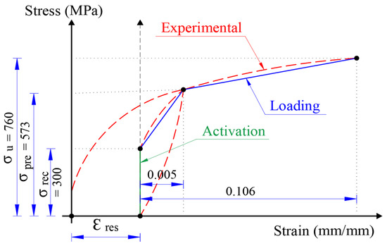 A bilinear stress–strain curve is used in ABAQUS to model longitudinal and transversal steel reinforcements covering both elastic and plastic regions. The simulated steel reinforcement’s modulus of elasticity and yield strength are 210 GPa and 508 MPa, respectively [61]. To replicate the elastic response of Fe-SMA bars in ABAQUS, an experimentally derived modulus of elasticity of 133 GPa and a Poisson’s ratio of 0.3 are utilized [61]. The metallurgical composition of Fe-SMA strengthening rebars is Fe-17Mn-5Si-10Cr-4Ni-1 (V, C) based on their mass ratio. Figure 2 illustrates a Shahverdi et al. [61] stress–strain curve for simulating the behavior of Fe-SMA in the absence of built-in ABAQUS models. ABAQUS employs a predefined field to model the pre-stressing effect, with the recovery stress being defined within the field. The stress–strain relationship utilized in this study is comparable to the one adopted in a study conducted by Hong et al. [38]. After stretching the rebars to a pre-strain value (εpre), the tensile force is removed. Meanwhile, a residual strain (εres) is obtained as a result of restoring the elastic and pseudo-elastic strains. When the heating system is activated, the green line in Figure 2 illustrates the recovery stress (σrec) observed in the Fe-SMA rebar. Additionally, Figure 2 depicts the tensile stress reapplied to the Fe-SMA rebar subsequent to loading the beam. The loading process yields a stress–strain curve (blue curve) that closely conforms to the experimental curve (red curve) depicted in Figure 2. Nevertheless, the blue curve exhibits horizontal and vertical stress shifts corresponding to residual strain (εpre) and recovery stress (σrec), respectively.