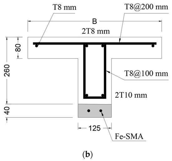 Pre-stressed T-beams and rectangular beams are both commonly used in construction. However, T-beam offers several advantages over rectangular beams in specific applications, i.e., bridge construction. One of the main advantages is that T-beam provides a more efficient distribution of stresses throughout the beam. Furthermore, the T-beam is more efficient in resisting bending and torsion forces. Undoubtedly, T-section beams are extensively used in civil engineering construction. However, to the best of the authors’ knowledge, very few studies have investigated the structural behavior of RC T-beams strengthened with Fe-SMA [41,42]. Cladera et al. [41] proposed a method to strengthen RC T-beams by externally anchoring U-shaped Fe-SMA strips to the beam’s web. Prestrained strips were thermally activated at 160 °C. Additionally, their experiments showed delayed crack appearance and improved shear capacity when U-shaped Fe-SMA strips were used. Nevertheless, the ductility of the samples was lower than anticipated and this could be attributed to the technique of anchoring the SMA strips to the T-beams. A recent study by Czaderski et al. [42] embedded Fe-SMA in a mortar layer to strengthen large-scale T-beams. A significant improvement in a beam’s shear capacity was achieved through active SMA stirrups in reducing the beam’s deflection, cracking, and stresses. According to Czaderski et al. [42], the ease of application of the proposed strengthening technique made it suitable for onsite applications.