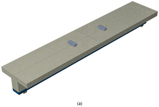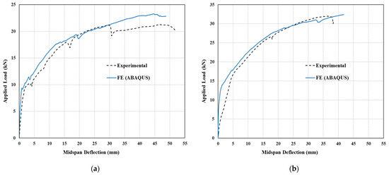In order to verify the accuracy of the developed FE models, experimental results (beams 10 and 11) from Shahverdi et al. [61] are compared to the FE modeling [61]. Each of the beams 10 and 11 had a cross-sectional dimension of 250 mm by 120 mm and a total length of 2500 mm. Four Fe-SMA bars (8 mm in diameter) were embedded in a shotcrete layer attached to beam 11’s soffit, while beam 10 only used two bars. According to the authors’ previous work [62], the load–deflection curves and crack patterns were validated and showed a good agreement with the experimental findings. However, for clarification purposes, only the load–deflection response verification results are presented in the current study in Figure 6. Although the numerical solution cannot account for all experimental conditions, such as initial thermal microcracks, it is still possible to observe certain discrepancies in the initial loading stages. Additionally, the contact surfaces in the FEA may not exhibit the expected fully bonded behavior under actual experimental conditions. Further details are available in the authors’ previous study [62].