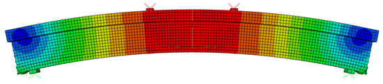 A parametric analysis of the present work is based on a single level of pre-stressing: 300 MPa. The predefined field in ABAQUS allows an input of the pre-stressing level to ensure rebars are enforced axially (simulating the activation process of Fe-SMA bars). Afterward, the beam is allowed to settle into equilibrium without any external load, exhibiting a prestress effect as illustrated in Figure 5. The maximum deflection upward was calculated numerically using ABAQUS and compared with the theoretical value, as discussed in the authors’ previous paper [62].