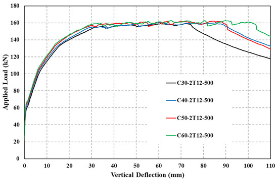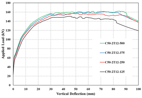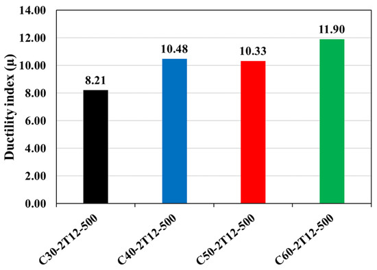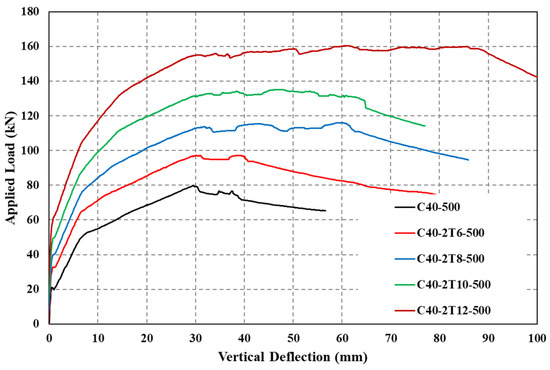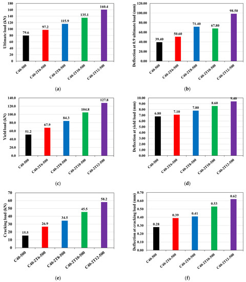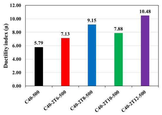 The purpose of this section is to examine the load–deflection response of RC beams when different Fe-SMA rebar diameters are used. As outlined in the previous section, the concrete grade, as well as the Fe-SMA prestressing level, remain constant (40 MPa and 40%, respectively). Notably, the recovery force varies with the size of the Fe-SMA bars. Specifically, Fe-SMA bars with diameters of 6, 8, 10, and 12 mm are capable of recovering 8.60, 15.29, 23.86, and 34.35 kN, respectively. The load–deflection behavior of a control beam and four pre-stressed beams with different Fe-SMA rebar diameters (6, 8, 10, and 12 mm) is shown in Figure 10. As aforementioned, the load–deflection relationship could be divided into three main stages (i.e., cracking, yielding of tension steel bars, and ultimate). Table 5 depicts the summary results of specimens in this section. Figure 11 compares the four models with the control beam in terms of ultimate, yielding, and cracking loads and their corresponding deflection values. It is noticed that all pre-stressed beams achieve higher yielding, ultimate, and cracking loads than the control beam. Increasing the diameter of the Fe-SMA rebar results in more significant cracking, yielding, and ultimate loads. For example, raising the diameter from 6 to 12 mm increases the cracking, yielding, and ultimate loads by approximately 116%, 88%, and 65%, respectively. Additionally, it should be noted that larger Fe-SMA rebar diameters are associated with more significant cracking, yielding, and ultimate loads. Likewise, increasing the Fe-SMA diameter enhances the beam’s ductility. As stated in the previous section, the ductility index is calculated based on the ratio of deflection values at 10% drop in the ultimate load to yield load. The Fe-SMA bar pre-stressed beam with a diameter of 12 mm demonstrated the highest ductility index of 10.48, indicating its significant capacity to induce more deformation after reaching its limit. It is worth mentioning that the numerical model of beam C40-2T10-500 surprisingly shows a ductility index slightly lower than C40-2T8-500 (as shown in Figure 12). However, the C40-2T10-500 beam exhibits larger toughness (area under load–deflection curve), indicating higher levels of dissipated energy.