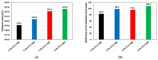 The purpose of this section is to investigate the load–deflection response of RC T-beams with different concrete grades (30, 40, 50, and 60 MPa). Meanwhile, the pre-stressing levels and reinforcement ratios of Fe-SMA are maintained at 40% and two bars of 12 mm diameter, respectively. A comparison of the load–deflection relationships between the four numerical models is shown in Figure 7. Curves generally show similar responses except for the hardening part just before failure. The curve has three main parts: the first starts linearly at zero and extends to the cracking load, the second linear relationship extends to the yielding point and has a lower slope. Following the yield point, a nonlinear curve can be noticed up to failure. Table 4 demonstrates the summary results of specimens in this section. Figure 8 compares loads and corresponding deflection values at three stages: cracking, yielding of tension steel bars, and ultimate. It can be noticed that an increase in concrete grade from 30 to 60 MPa results in an increase in cracking, yielding, and ultimate loads of approximately 11%, 2%, and 2%, respectively. At higher loading levels, the depth of the concrete compression block decreases, resulting in a minor contribution from the concrete grade. This could be attributed to the observed effect. Figure 9 demonstrates the ductility index values for the four numerical models. To provide a fair comparison, ductility is determined as the deflection ratio at 10% drop in the peak load to yield load [63]. It is seen that the higher the compressive strength, the higher the ductility of the beam. Notably, increasing the compressive strength of the concrete from 30 to 60 MPa results in a marked improvement in the ductility index, which rises from 8.21 to 11.90, indicating a substantial increase of 45%. The reason for this is that the concrete block’s strength increases on the compression side, causing the neutral axis to shift upwards and away from the balanced neutral axis. Thereby, the concrete cross-section becomes more under-reinforced (i.e., tension failure becomes more likely).