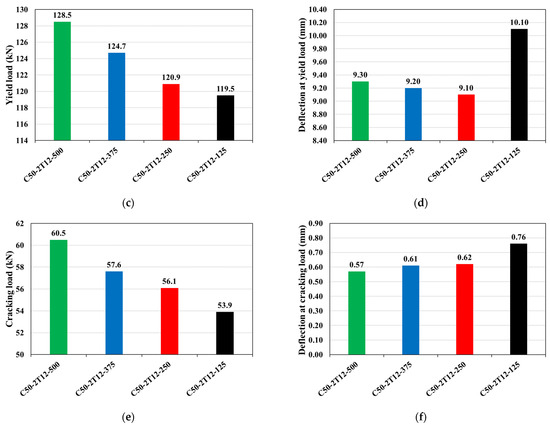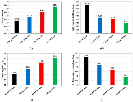 Comparison of loads and corresponding deflection values at (a,b) ultimate, (c,d) yield, and (e,f) cracking.