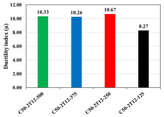 The purpose of this section is to demonstrate the effects of flange width on the flexural response of RC T-beams. Four flange widths are used in this study: 500, 375, 250, and 125 mm. The concrete grade and Fe-SMA reinforcement diameter are constant (40 MPa and 12 mm, respectively). Figure 13 exhibits the effect of flange width on the load–deflection relationship. The curves follow the same behavior pattern mentioned in previous sections (i.e., cracking, yielding of tension steel bars, and ultimate). Notably, as the flange width increases, the curves tend to exhibit strain hardening behavior, indicating improved post-yield performance. Figure 14 compares ultimate, yielding, and cracking loads along with their respective deflection values. A reduction in flange width decreases specimen ductility and load-carrying capacity, as seen in Table 6. Specifically, the T-beam with a 500 mm flange width achieved a greater capacity of 7% than the rectangular-sectional (R-sec) beam. Moreover, an increase in the ductility index of 25% is recorded for beams with 500 mm flange width compared to the R-sec beam. Figure 15 depicts a comparison of ductility indexes. These findings align with the observations made by Khatami and Kheyroddin [64], suggesting that considering the compression flange in beam design promotes enhanced ductile behavior. Figure 16 depicts the cracking patterns, where the tension damage in concrete can be observed. It is shown that increasing the flange width distributes more cracks along the beam length. Consequently, T-beams with larger flange widths demonstrate improved deformation capacity and enhanced ductility, effectively providing additional warning signs before eventual failure.