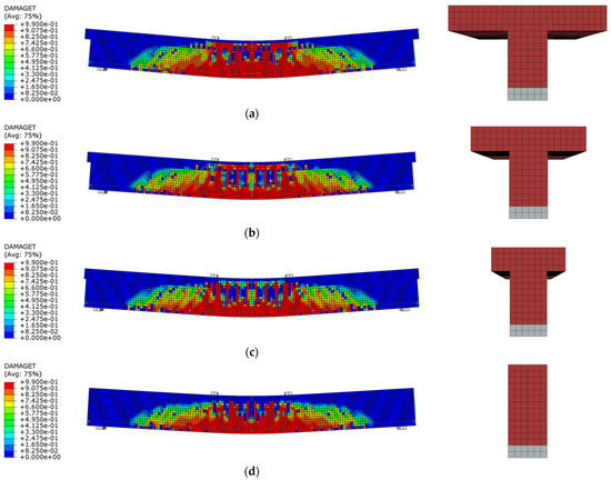 Effect of flange width on cracking patterns: (a) flange width = 500 mm, (b) flange width = 375 mm, (c) flange width = 250 mm, and (d) flange width = 125 mm.