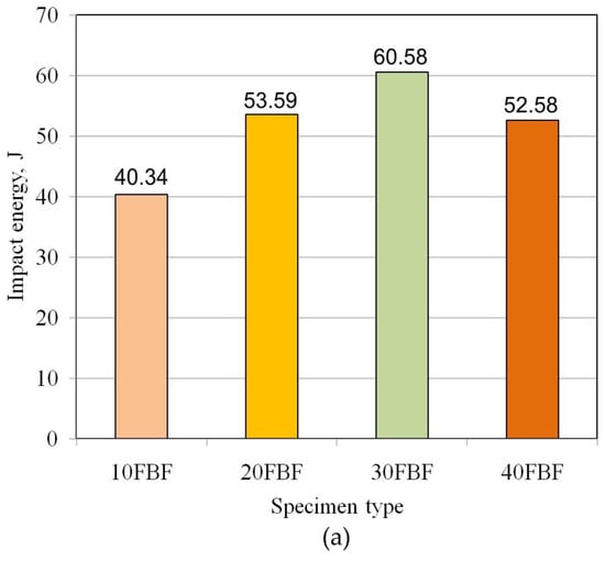 Figure 3 shows the effects of Aloe Vera and fibre content on the strength of the manufactured samples. As can be seen, when the fibre content increases from 10% to 40% FBF, the results show an increase in impact energy. However, the maximum impact energy was recorded at 30 wt.% of FBF for the Aloe Vera-treated FBFs (Figure 3a) due to good interfacial bonding between the false banana fibre and the polypropylene matrix. For the reinforcement of natural fibres in the matrix, several problems occur along the interface due to the presence of hydrophilic hydroxyl groups. This hinders the effective reaction with the matrix. In addition to this, pectin and waxy substances cover the reactive functional groups of the fibre and act as barriers to interlocking with the matrix [,]. To overcome this, early treatment, especially with NaOH, plays a vital role in making the surfaces irregular, and Aloe Vera is very crucial in increasing the mechanical strength by maintaining the hydrophilic properties. A good result was recorded for the Aloe Vera-treated FBF-reinforced PP composite. This was 60.58 J of impact energy, achieved at 30 wt.% of FBF in the PP composite, and beyond this fibre content, it was observed that the impact strength results decreased.