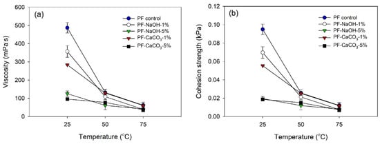 (a) Effect of temperature on adhesive viscosity in five treatments; (b) effect of temperature on cohesion strength of adhesive in five treatments.