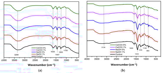 Compared to the control PF, the intensity at wavenumber 1433 cm−1 increased in PF mixed with NaOH catalyst but decreased in PF mixed with CaCO3 catalyst (Figure 4). The wave number between 1340 and 1470 cm−1 indicates the presence of alkane (CH) groups with strong intensity. Some intensity changes occurred in solid samples compared to liquid samples. There was a peak in the range of 3600–3200 cm−1, which indicates the presence of OH groups in the PF adhesive. It can be seen that the absorption intensity was lower at 3134–3166 cm−1. This could have been caused by reduced OH groups in the cured (solid) adhesive sample. The strong absorption peaks between 1600 and 1700 cm−1 can be attributed to the C=C vibration strains on the aromatic and at 3200–3600 cm−1 to the hydroxyl OH groups [21]. The peak of 1148 cm−1 indicates the presence of the C-O functional group, which had a strong intensity.