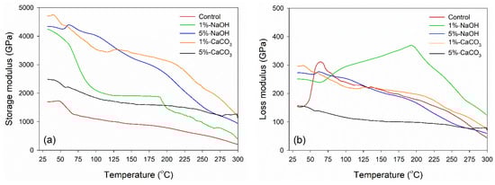 DMA thermogram of PF adhesives mixed with different types and levels of catalysts. (a) Storage modulus, (b) loss modulus.