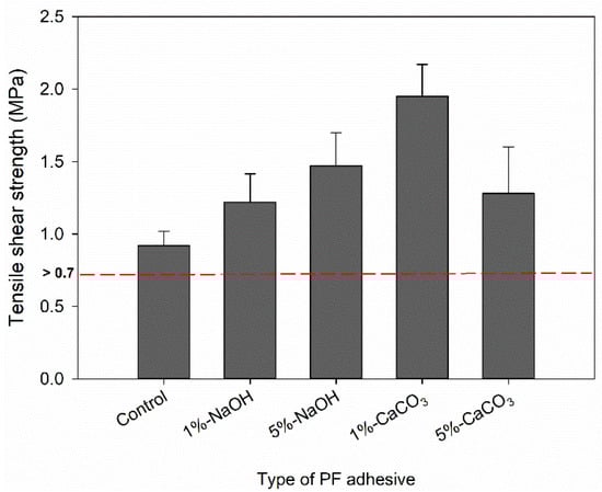 The viscosity value of PF adhesive required by SNI 06-4567 is 130–300 cps [16]. Only PF-CaCO3-1% yielded the standard compliant viscosity value. The PF control had the highest viscosity and cohesion strength. High viscosity can affect the storage period of the adhesive and higher viscosity can shorten the storage period. The type and level of catalyst used affect the viscosity and cohesive strength. The graph shows that NaOH had a higher effect than CaCO3, whereas the 1% level of each catalyst had a higher effect on both viscosity and cohesive strength compared to the addition of 5%. This condition is also supported by previous reports, which stated that the addition of NaOH as a catalyst reduced the viscosity of PF. In general, a concentration of 20% of a catalyst solution contributes to adding a large amount of water, thereby changing the viscosity of the adhesive. This shows that at a high level (5%), the added catalyst contains more hydrogen groups from the solvent, so the viscosity of the adhesive becomes lower. The appropriate viscosity and cohesive strength of the adhesive provide a good application to wood. Therefore, the determination of the optimal catalyst level must be considered as an important factor.