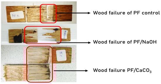The form of the sample damage indicates the cause of the failure, such as structural failure, cohesive failure, and adhesive failure. The control PF sample (Figure 7) shows that the damage that occurred was a structural failure, which means that the damage occurred due to the mechanical properties of rubber wood, which are lower than the bond strength of PF. This condition was also demonstrated by the structural failure of the PF-NaOH-1% and PF-CaCO3-1% samples. Adhesive failure was found in the PF-NaOH-5% and PF-CaCO3-5% samples, which means that this damage arose due to the weak bond between the adhesive and the plywood that occurred, so the surface area of the plywood that failed was even greater. Table 5 shows the percentage of failure of plywood after the bond strength test was carried out.