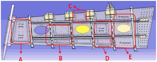 Before wing box demonstrator assembly, the wing box lower panel (LWP) material has been modelled and sensorized for SHM system implementation. The sensor distribution was defined by taking into consideration the potential impact locations settled in the project phase. The preliminary sketch of a possible sensor network layout is provided in Figure 2. The regions of interest for such a large wing panel have been indicated by a red rectangle, each labelled by a capital letter. Coherently with the main principle of the tomography, each region is supposed to be monitored by a specific 1-D or 2-D sensor layout geometry according to the target (skin-spar bonding line or surface impact). In this work, an optimized circular 2-D geometry is considered for BVID.