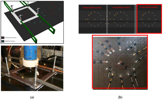 The PWAS (Piezoelectric Wafer Active Sensors) tested were DuraAct P-876.SP1 with dimension “16 × 13 × 0.6 mm”, active area of 0.64 cm2 and a mass of 0.5 g. DuraAct patches (commercial rectangular and customized circular shape) employed (see Figure 3b) were both based on a thin piezoceramic foil between two conductive films, all embedded in a ductile composite polymer structure. In this way, the brittle piezoceramic is mechanically pre-stressed and electrically insulated, which makes the transducers more robust and therefore applicable on curved surfaces. Thirteen transducers have been permanently bonded on the structure by employing a vacuum-based secondary bonding procedure of common use by the aircraft industry. The radial sensors pattern is adopted for optimal monitoring of the enclosed surface of the plate. A fourteenth disk is installed at the circle’s center to perform a propagation velocity analysis. The overall configuration of the instrumented panel is shown in Figure 3b.