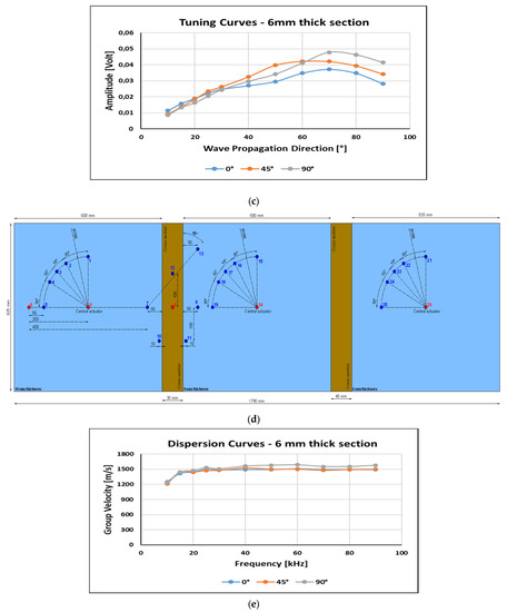The elastic waves are launched by broadband transducers located on the surface of the structure. In this regard, the PWAS sensor satisfies most of these characteristics and the most widely used sensor for actuator or sensor applications having dimensions 16 × 13 × 0.6 mm, active area of 0.64 cm2 and a mass of 0.5 g has been tested. The source signal, generated by (HP/Agilent 33120A), consists of a 4.5 sine cycles signal with 10 V peak-to-peak tension Hanning window and a 60 kHz central frequency, adopted after an experimental PWAS guided wave tuning along 0, 45 and 90 degree propagation directions (Figure 3d). The signal amplitude and the influence of the edge reflections have been considered as key parameters in the central frequency choice. An amplifier has been used to burst the PZT sensors with up to 80 V peak-to-peak signal in the experiments. The ultrasonic signal has been digitized and recorded directly in a four-channel digital oscilloscope with 100 MHz sampling rate (Agilent InfiniiVision DSO7104A). The digital ultrasonic signals are then downloaded to a personal computer and post processed. In the preliminary analysis, dispersion curves of 6 mm thick bay of tapered panel have been calculated along 0, 45 and 90 degree propagation directions (Figure 3e).