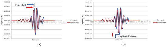 Numerical simulation of wave propagation across an impact delamination: (a) time shift between pristine (red) and after delamination (blue) signals; (b) amplitude variation between pristine (red) and after delamination (blue) signals.