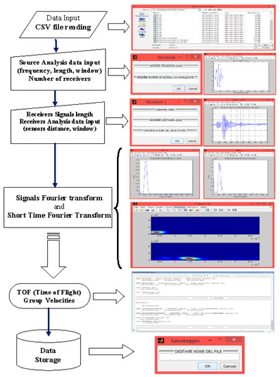 - Signal matrix reading by CSV file. This matrix was provided directly by the acquisition system and consists of n columns of which the first is the time vector, the second the source vector and the others are the receiver’s vectors;