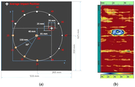 The geometry of Figure 8a and the measured impact area of Figure 8b are to be used to set the input specs for the SHM graphical user interface and to provide a reference for this preliminary validation, so the results achieved by applying the DI_GW index are herein provided.