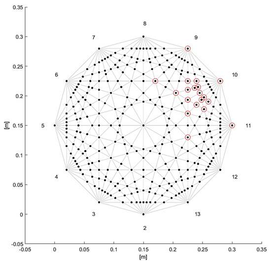 Starting again from the sensor configuration (in Figure 8a), the paths of the guided wave signal intersections can be schematically represented as points in Figure 10. Then, the DI_CC indicates the paths on which the anomaly was revealed, and a specific algorithm is then applied to reconstruct the surface extension and barycenter estimation.