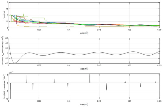 Figure 11. Top plot: light bulbs ratios (colored lines) and least square polynomial of the mean ratio (black bold line); middle plot: first derivative (slope) of the polynomial; bottom plot: curvature of the polynomial. - Averaging the ratios computed at the previous step to find a unique function; the least square polynomial of this curve is then computed (see the black line in the plot at the top of Figure 11). Similarly to the single curves of the dot ratio, this line is characterized by a peak very close to the null value of the area; then after a fall, the asymptotic region starts;