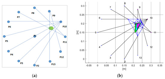 Starting from the sensor configuration (in Figure 8a), a network of propagation paths can be built considering all the possible combinations of actuator-sensor by associating a specific damage index formulation to each path (Figure 9a). Each pair of intersecting paths defines a node inside the space enclosed by the ultrasonic sensors, which contains the structural condition of its surrounding area. A contour reconstruction is then provided (Figure 9b).