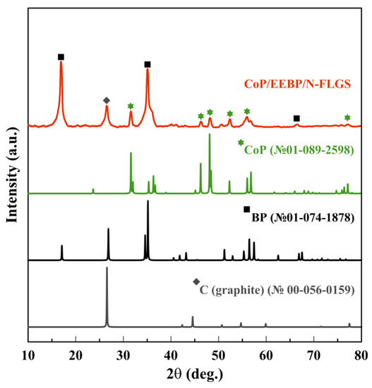 The crystal structure of CoP/EEBP/N-FLGS was characterized via X-ray diffraction. Figure 1 shows the XRD pattern of the CoP/EEBP/N-FLGS nanocomposite as well as the standard cards for CoP (PDF N°01-089-2598), BP (PDF N°01-074-1878) and graphite (PDF N°00-056-0159). The diffraction peak at 26.5° corresponded to the (002) crystal plane of graphite (PDF N°00-056-0159, space group: P63/mmc, cell parameters: a = 2.462 Å, b = 2.462 Å, c = 6.711 Å, α = 90°, β = 90°, γ = 120°), which confirms the presence of few-layer graphene structures [34]. The presence of orthorhombic CoP in the composite is confirmed by clearly defined diffraction peaks located at 31.6°, 46.3°, 48.3°, 52.4°, 56.0° and 77.1° corresponding to the (011), (112), (211), (103), (020) and (222) crystal planes of CoP (PDF N°01-089-2598, space group: Pnma, cell parameters: a = 5.077 Å, b = 3.281 Å, c = 5.587 Å, α = 90°, β = 90°, γ = 90°). Diffraction peaks at 16.9°, 35.0°, 56.3° and 66.8° correspond to (002), (111), (016) and (204) crystal planes of orthorhombic BP (PDF №01-074-1878, space group: Bmab, cell parameters: a = 3.32 Å, b = 4.39 Å, c = 10.52 Å, α = 90°, β = 90°, γ = 90°). It should be emphasized that no peaks typical of cobalt, cobalt oxides or other phases of cobalt phosphide can be found in the diffraction pattern. Thus, the results of XRD analysis indicate the successful formation of graphene–phosphorene structures decorated with CoP nanoparticles. As is known, the presence of CoP favorably affects the activity of composite catalysts [5,35]. According to the literature data, the mechanism of CoP formation on the EEBP surface can be explained as follows: During BP exfoliation, a large number of defects are formed at the edges, resulting in P atoms with lower coordination and a larger number of lone-electrons and, accordingly, a higher reducing ability [36]. As a result, Co2+ ions can be reduced to Co atoms at defect positions and then, probably, bond with adjacent P atoms and form phosphides [37].